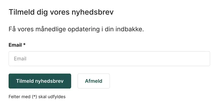 I det andet felt konfigurerer du så det indhold, som brugerne bliver mødt af i deres interaktion med modulet, samt den liste, som den tilmeldte mailadresse skal sættes på. Du kan give tilmeldingsformularen en overskrift, en beskrivende teaser-tekst, vælge hvilken liste (eller lister) som modulet skal tilsluttes, og så har du mulighed for at tilpasse beskrivelsen af vilkår for tilmelding, samt den afsluttende bekræftelsestekst når brugeren har til- eller afmeldt sig fra listen via modulet.
